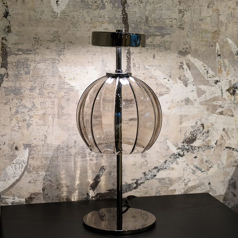 Настольная лампа выполнена в стиле модерн. Основание из черного никеля дополнено плафоном из серого дутого стекла и проводом антрацитового цвета.