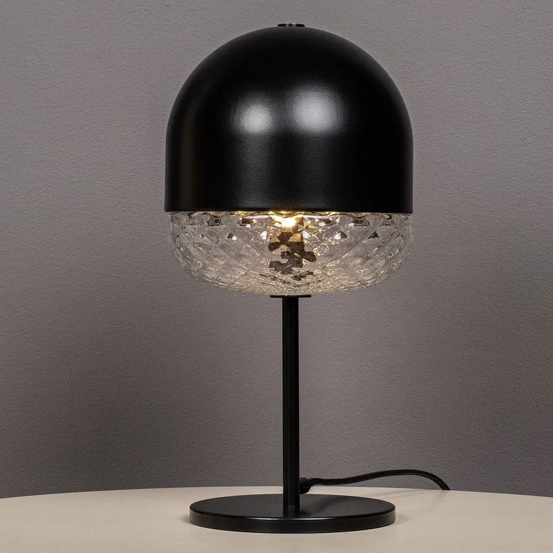 Настольная лампа на круглом основании выполнена в современном стиле из кованого металла. Высокий абажур дополнен объемным плафоном из выдувного стекла с ромбовидным декором, изготовленным по классической венецианской технологии. Настольная лампа рассчитана на одну лампу.