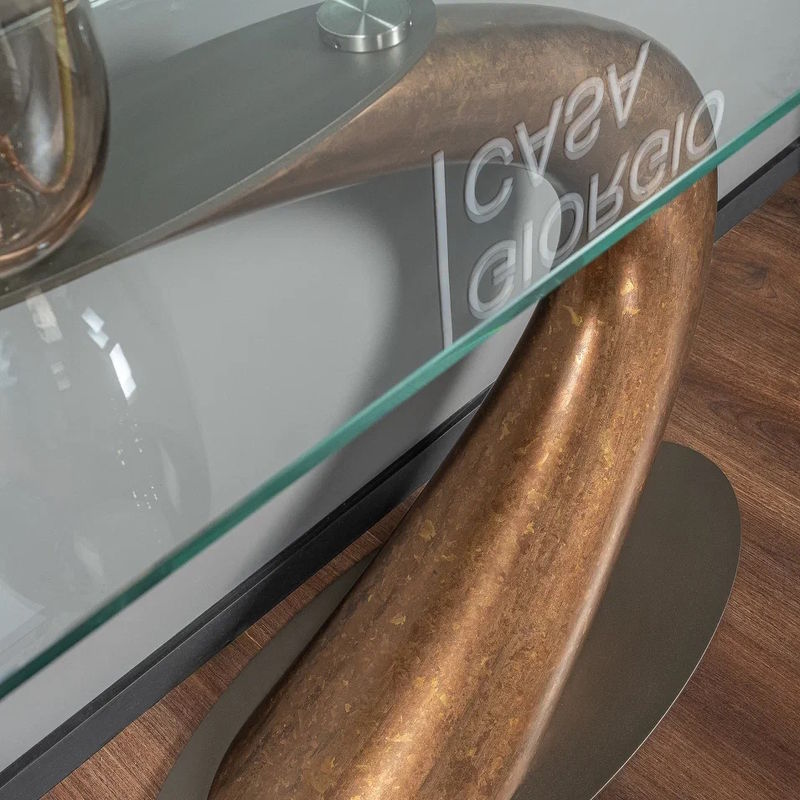 Консоль с изогнутой ножкой на металлическом основании и стеклянным топом выполнена в современном стиле.