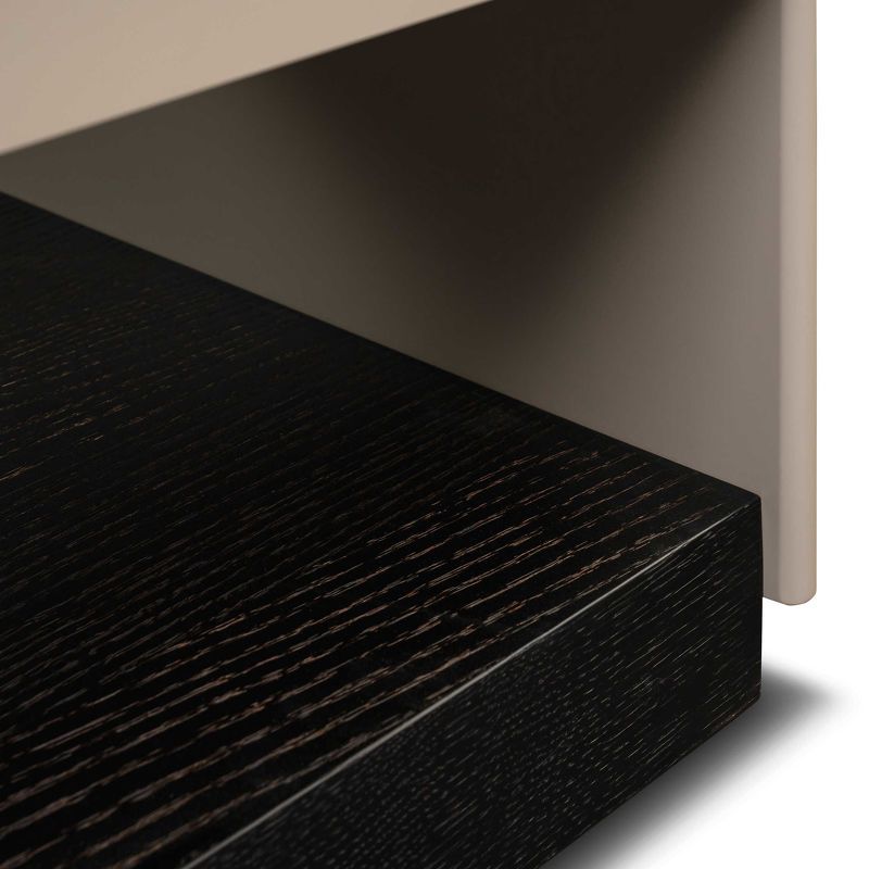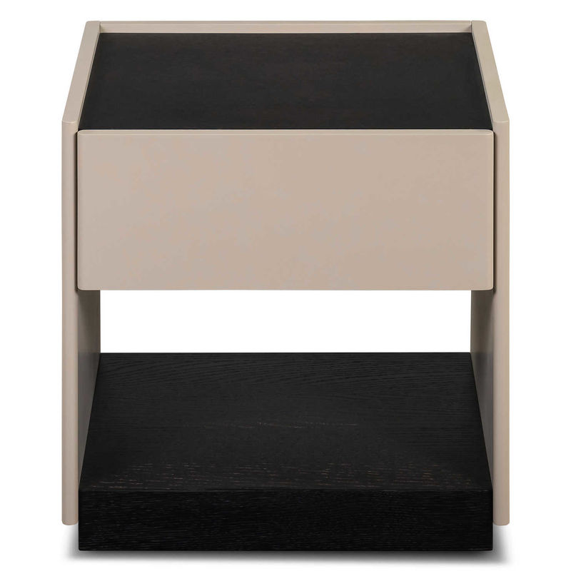 Прикроватная тумбочка от итальянского бренда Fratelli Barri. Каркас из высококачественной МДФ. Столешница в отделке шпоном дымчатого дуба, фасад ящика в отделке бежевым матовым лаком.