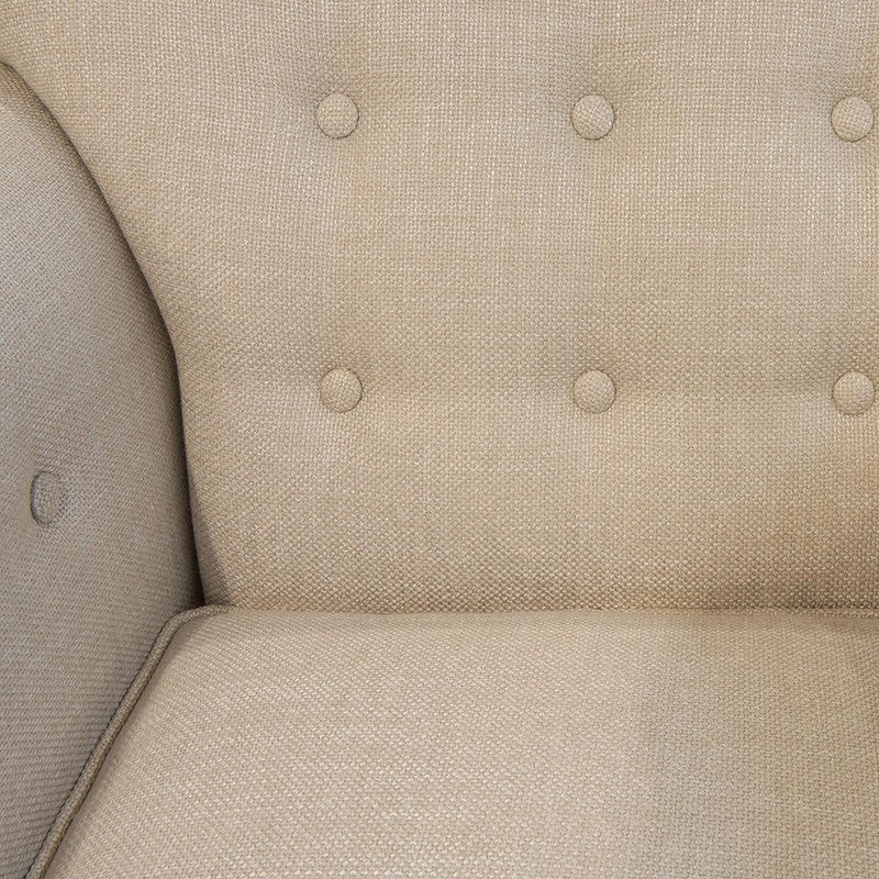 Каркас — натуральный массив дерева, отделка (ножки) — натуральный шпон махагона, обивка — кремовая рогожка.