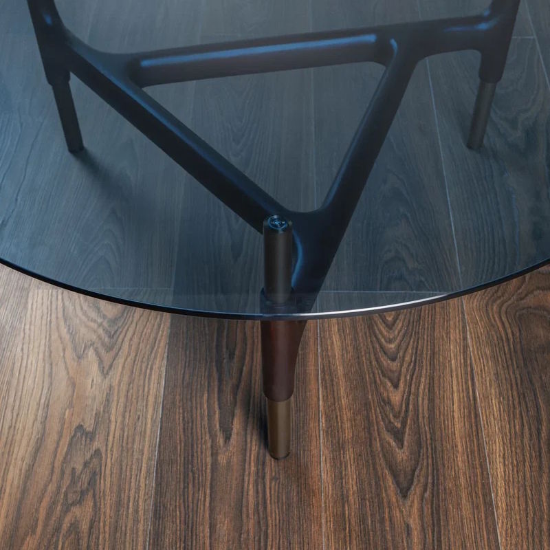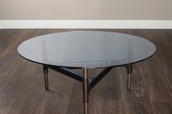 Столешница столика выполнена из закаленного стекла, основание металлическое в цвете бронза, ножки из массива Катальпы в тонировке дымчатый орех.