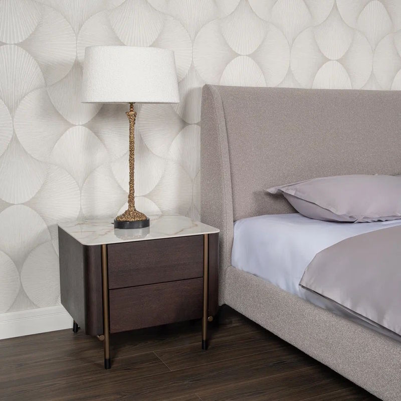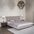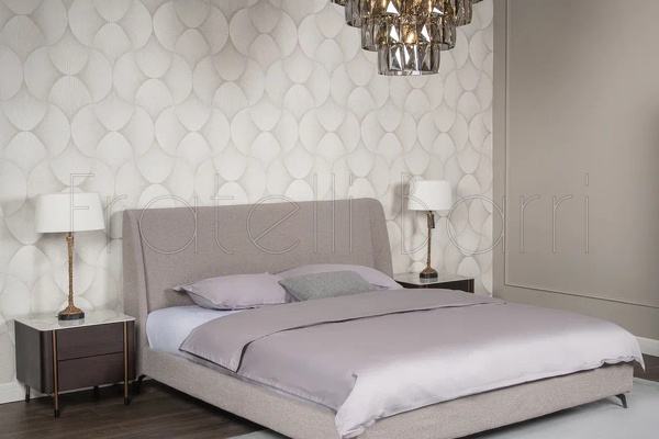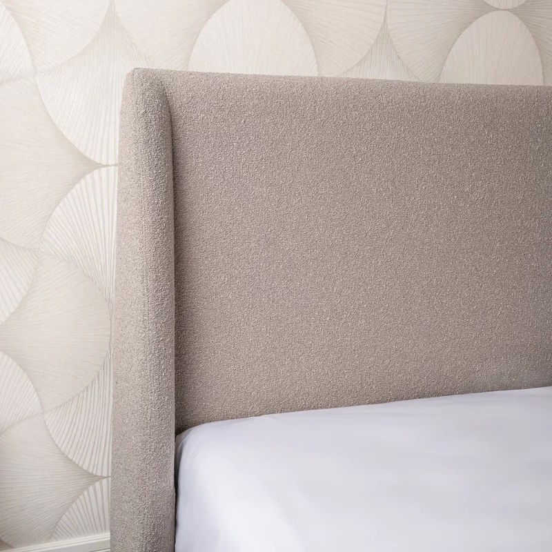 Кровать обита текстурированной тканью букле в серых тонах, ножки из нержавеющей стали с черным порошковым покрытием.