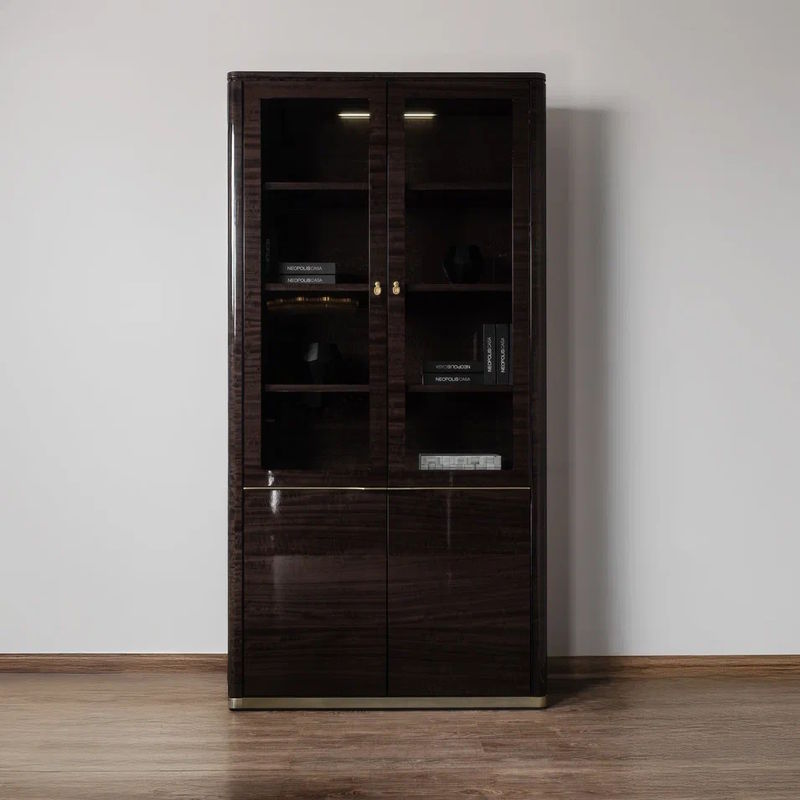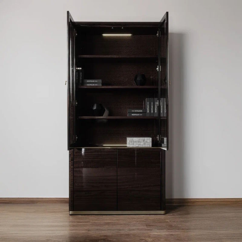 Корпус и полки изготовлены из высококачественного МДФ. Внутри на крышке книжного шкафа LED подсветка. Дверки оснащены системой soft closing для плавного закрывания.