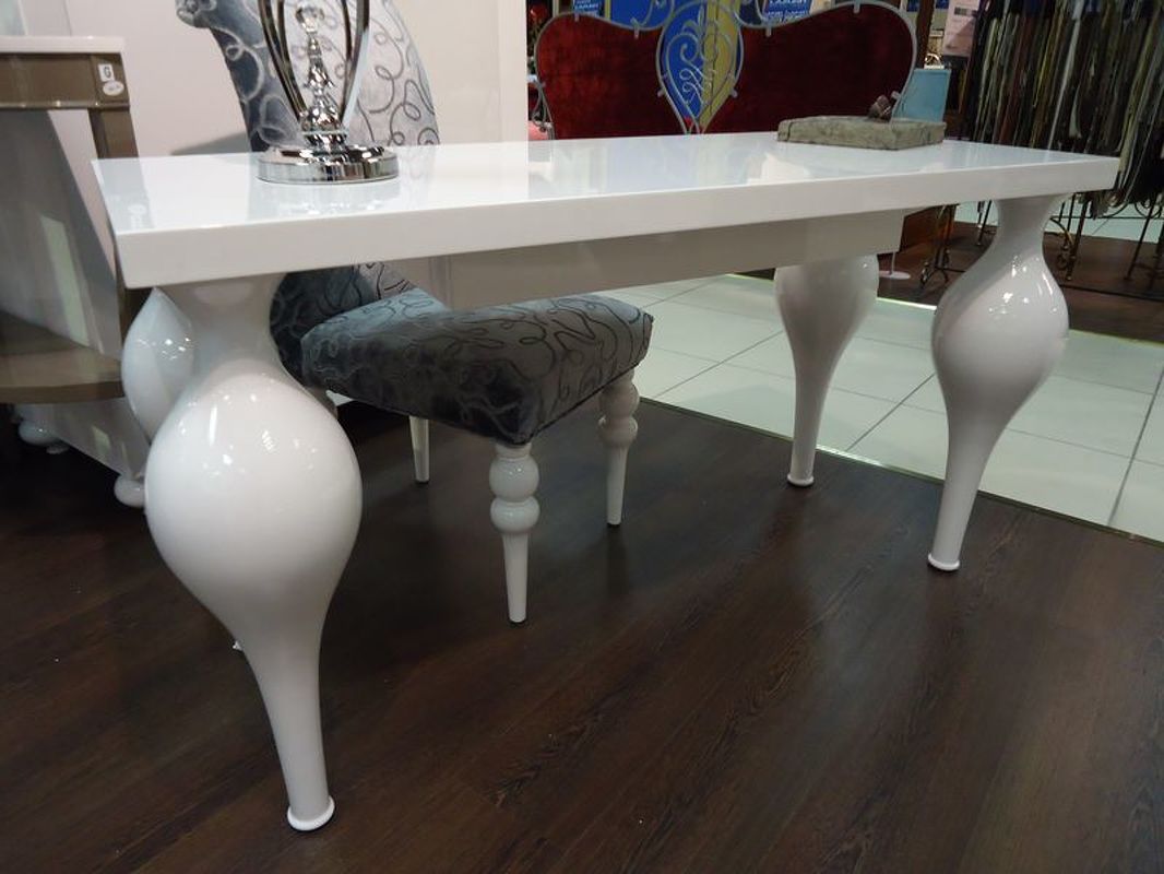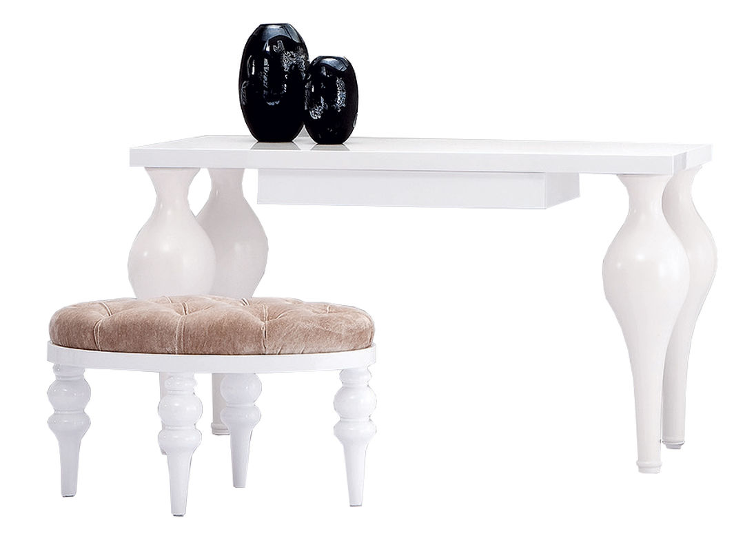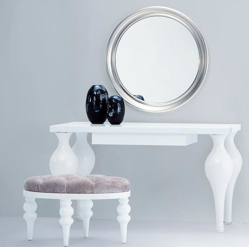Туалетный стол выполнен в стиле Ар деко. Отделка белый блестящий лак. Оснащен 1 выдвижным ящиком. Туалетный столик просто верх изящества! Согласитесь: несмотря на его приличные размеры, он создаёт атмосферу невесомости. Поскольку площадь туалетного столика достаточно велика, он может служить компактным письменным столом для владельца.
