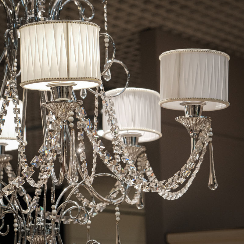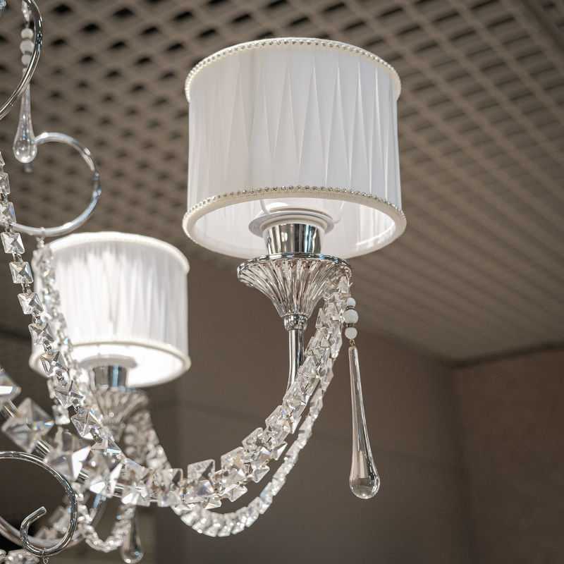 Подвесная люстра, отделка белые абажуры, хром, прозрачный хрусталь, прозрачное стекло Murano