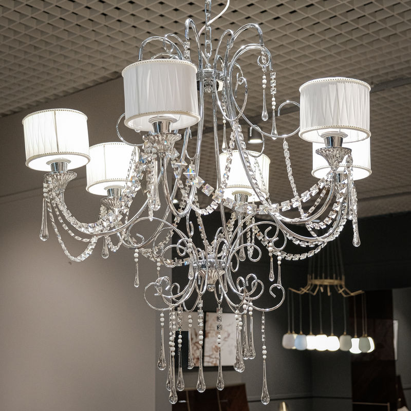 Шикарная люстра в классическом стиле украсит изысканный элитный интерьер. Структура выполнена из хромированного метала, Муранское стекло и прозрачные стеклянные цепочки. Диаметр абажура 15 см.