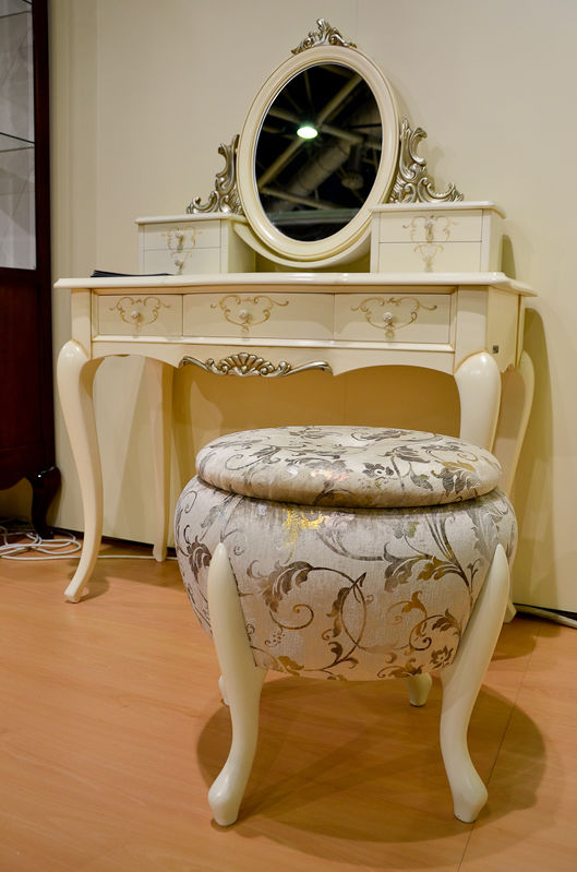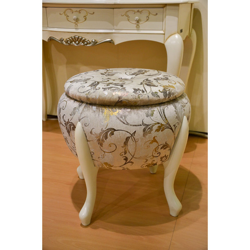 Пуфик на гнутых ножках выполнен в классическом стиле. Оригинальное сидение необычной округлой формы скрывает в себе вместительное отделение для хранения вещей. Пуфик обит коллекционной тканью из ассортимента фабрики.