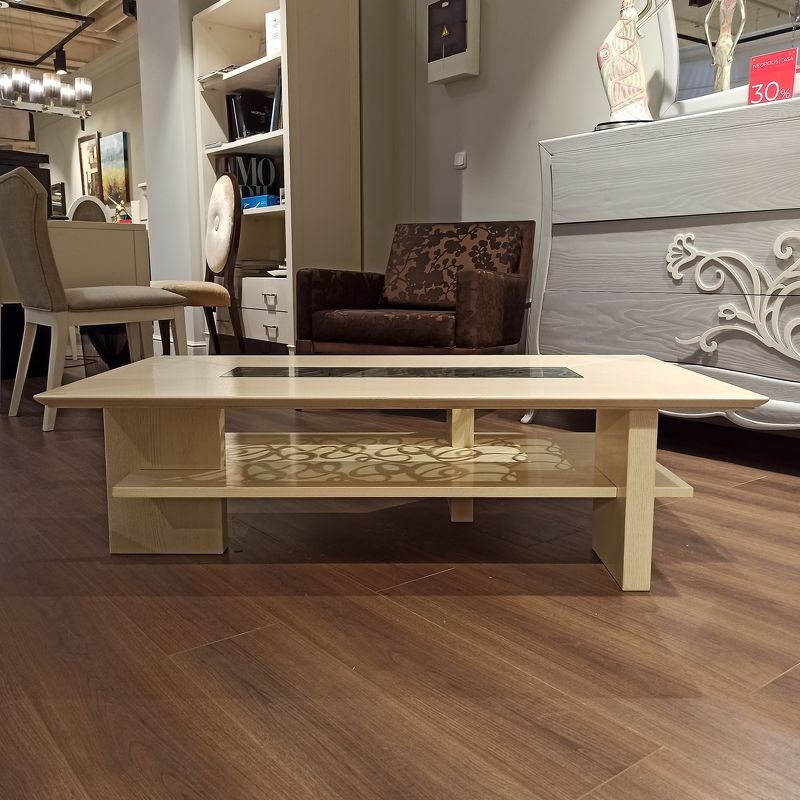 Журнальный столик прямоугольной формы выполнен в стиле Ар-деко из массива ясеня. Оснащен полкой под столешницей. В центре топа ажурная вставка из МДФ.