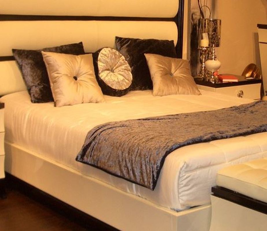 Комплект состоит из покрывала размером 260*275 см (стежка 180*215 см, наполнитель дюрафил) белоснежного цвета, пледа 2-х стороннего 220*70 см из синего бархата, 2 подушек 67*55 см из синего бархата, 2 подушек 45*45 см из серебристого бархата в рубчик с пуговицей в центре, 1 круглой подушки с пуговицей.
