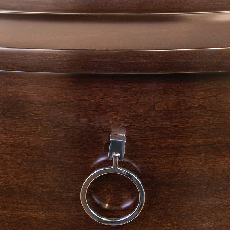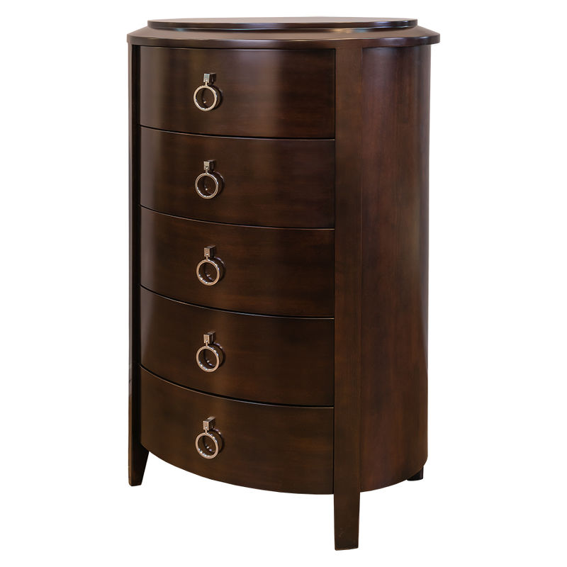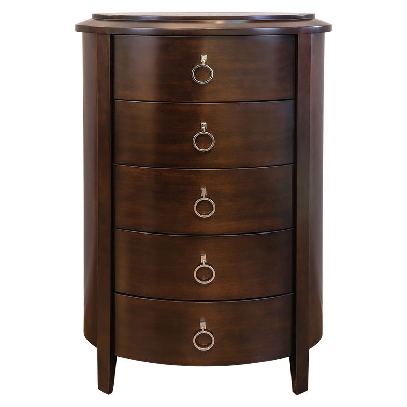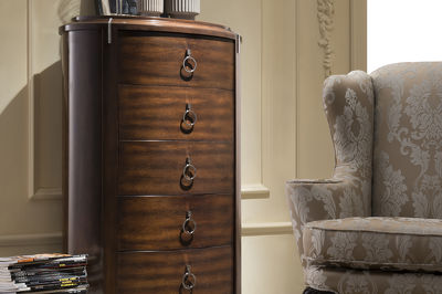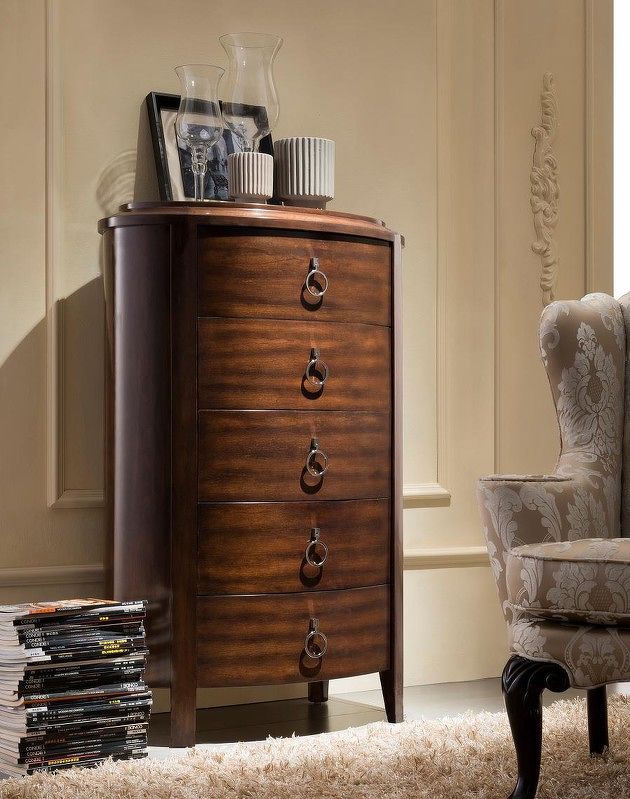 Комод высокий с 5 выдвижными ящиками выполнен в стиле Неоклассика. Отделка шпон вишни. Сделан из массива дерева и высококачественного МДФ высокой плотности.