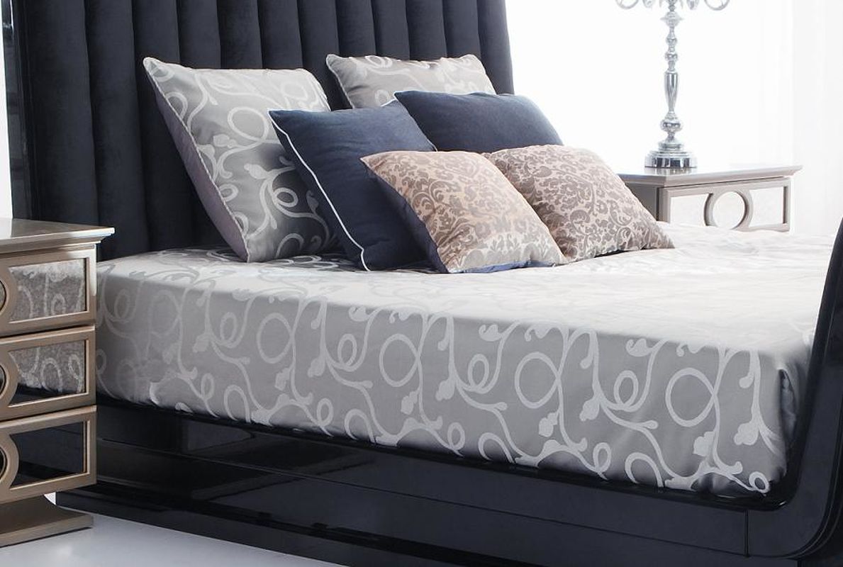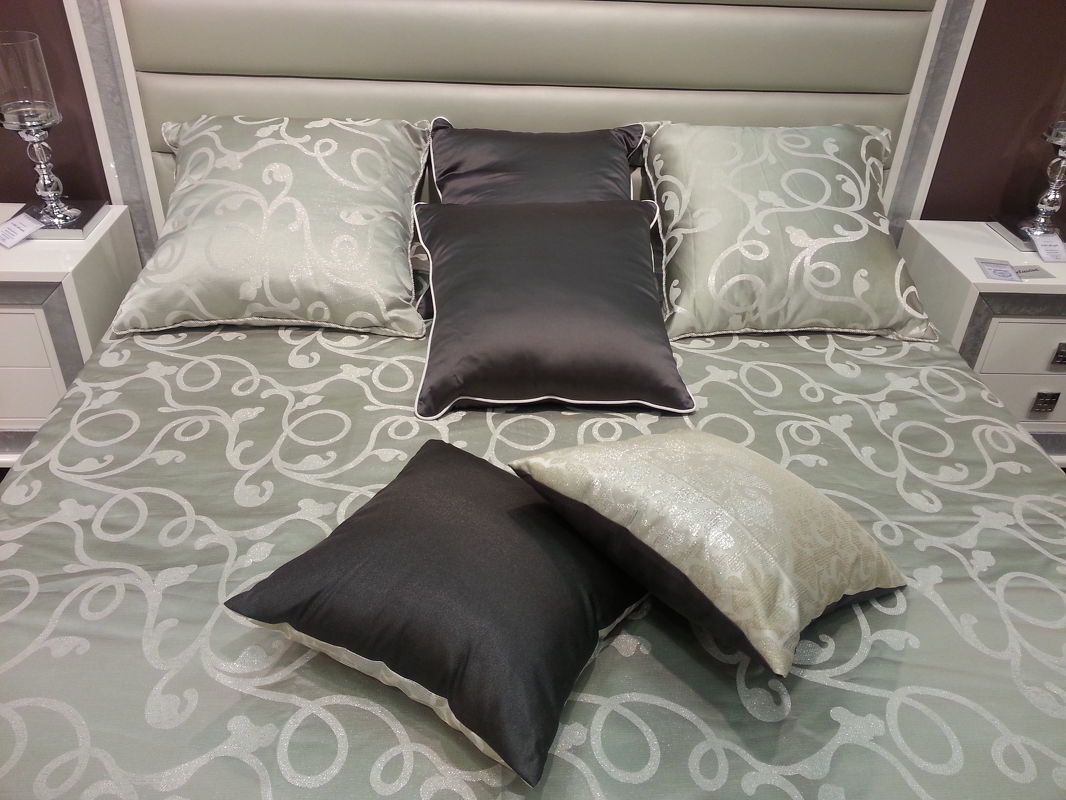 Дизайнерский комплект текстиля для спальни. В сет входят: покрывало, простыня, 2 большие квадратные подушки, 2 средние квадратные подушки, 2 маленькие квадратные подушки.