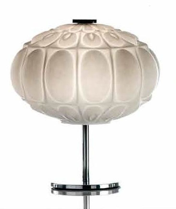 Настольная лампа на круглом основании выполнена в современном стиле. Круглый плафон из муранского стекла декорирован узором.