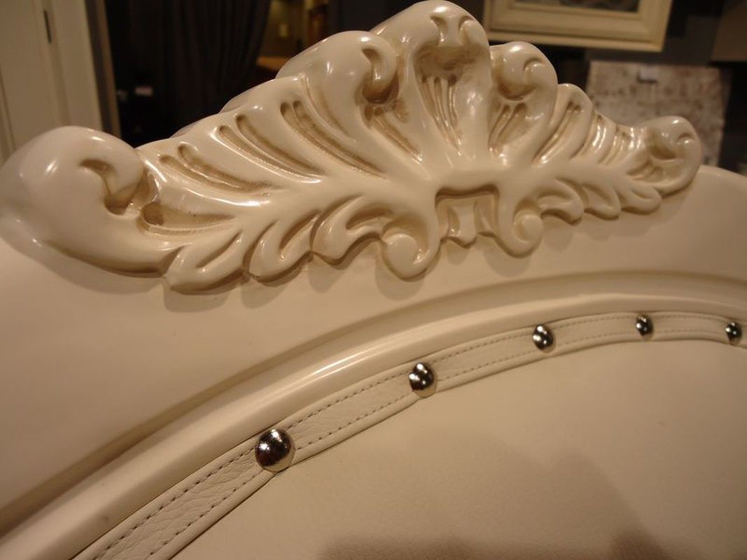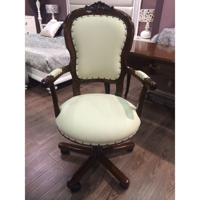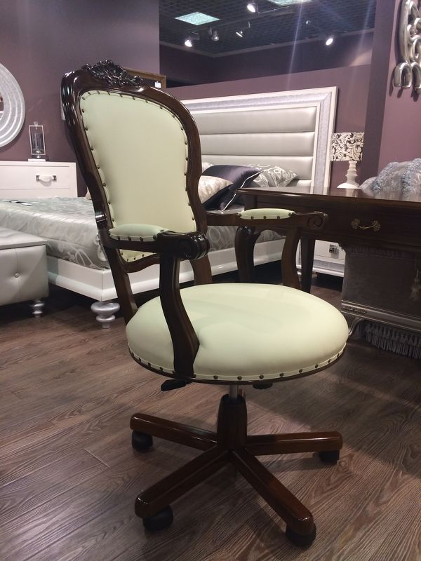 Рабочее кресло с высокой спинкой выполнено в классическом стиле. Опирается на базу на колесиках с функцией изменения высоты.