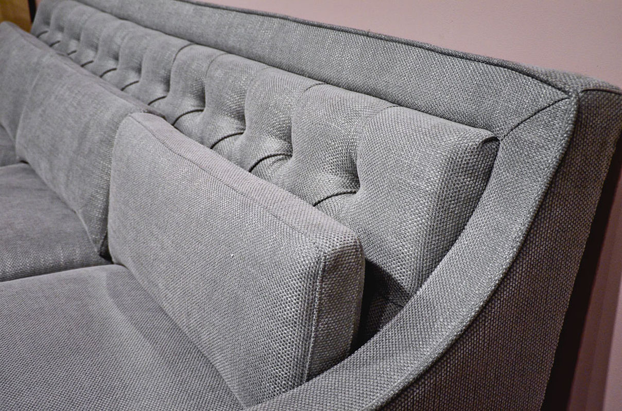 Каркас — натуральный массив дерева, отделка — натуральный шпон махагона, обивка — серо-голубая рогожка. Спинка декорирована стежкой капитоне. Вокруг ножек — декоративное обрамление металлическими гвоздиками.