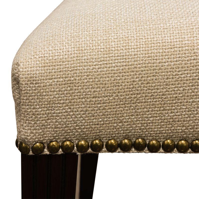 Каркас — натуральный массив дерева, отделка — натуральный шпон махагона, обивка — бежевая рогожка. Спинка обита тканью со стежкой капитоне, спинка сзади и сиденье снизу декорированы гвоздиками.
