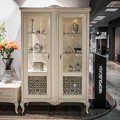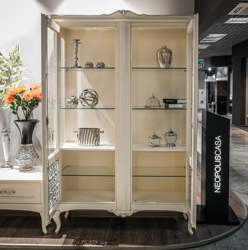 Витрина, отделка кремовый полуматовый лак, вставки и ручки серебро