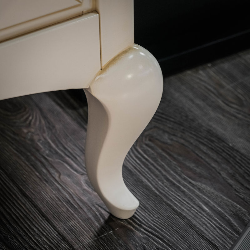 Витрина выполнена в классическом стиле. Опирается на ножки кабриоли, нижняя часть царги по центру украшена декоративным резным элементом.