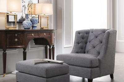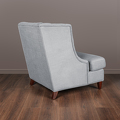 Каркас — натуральный массив дерева, отделка — натуральный шпон махагона, обивка — серо-голубая рогожка. Спинка и «уши» декорированы стежкой капитоне. Вокруг ножек — декоративное обрамление металлическими гвоздиками.