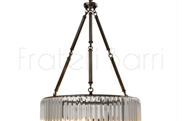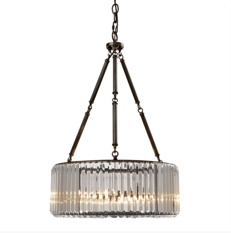 Этот очаровательный потолочный подвес с абажуром в стиле ар-деко украшен элементами из бронзы и декоративными стержнями из хрустального стекла.
