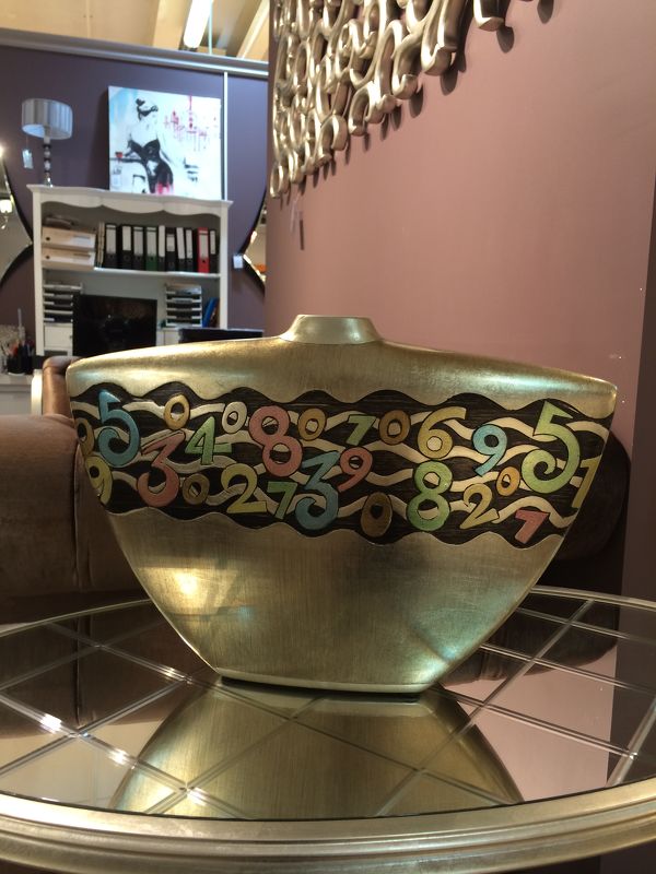 Трапециевидная форма вазы передает колорит эпохи античности. Волнистые линии в орнаменте и хаотично расположенные цифры также относят наше восприятие во времена Евклида и Пифагора. А вот интересная, переходящая от темного к светлому, цветовая гамма, и серебряная отделка создают впечатления металлической поверхности вазы.