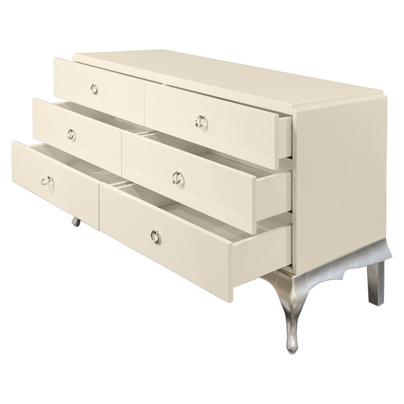 Комод, отделка перламутровый кремовый лак, ножки сусальное серебро, покрытое лаком шампань