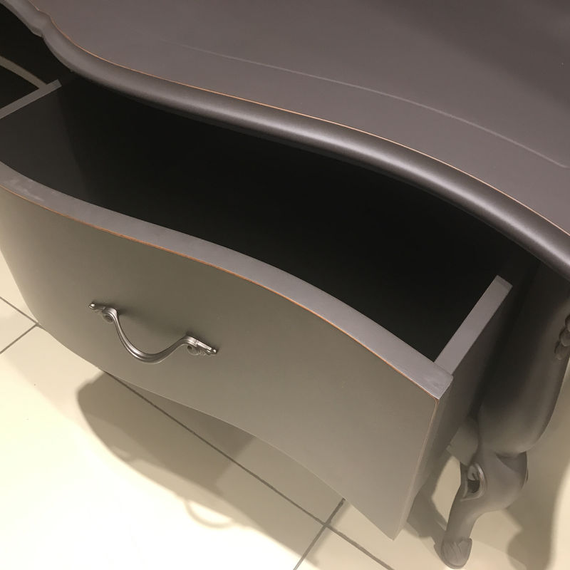 Оснащена двумя выдвижными ящиками и открытыми полками.