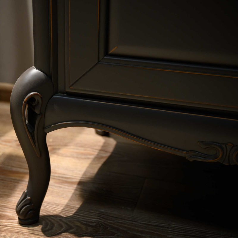 Верх выполнен из многослойной древесины в шпоне ореха, боковые части и фасады из массива хвойных пород в шпоне ореха, ножки - из массива бука.