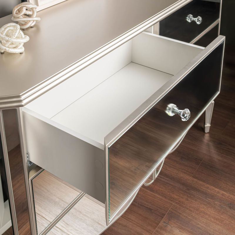 Столешница покрыта лаком, цвет - серебряное напыление. Боковые поверхности, фасады и ножки декорированы зеркалами. На ножках металлические колпачки. 6 выдвижных ящика с направляющими скрытого типа. Направляющие с доводчиками для плавного закрывания.