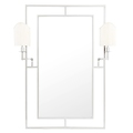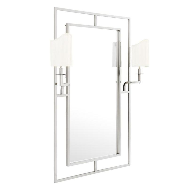 Прямоугольное зеркало в раме из стали и железа. Оснащено двумя бра с абажурами.