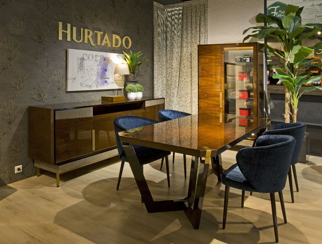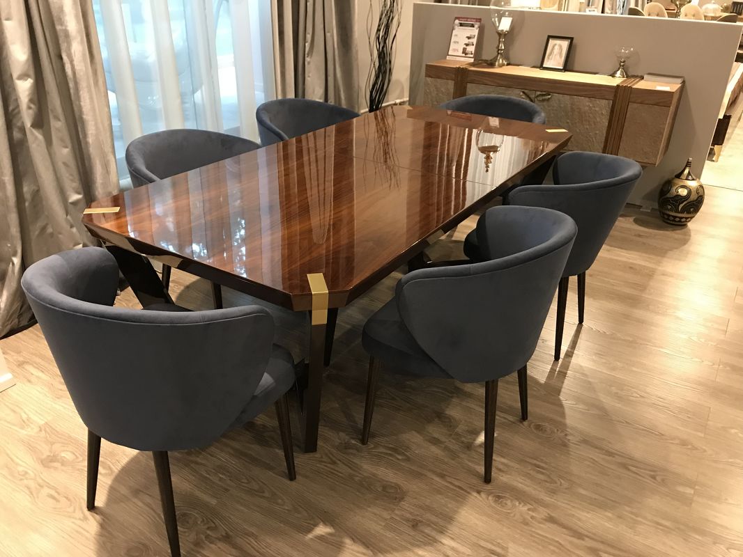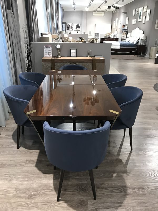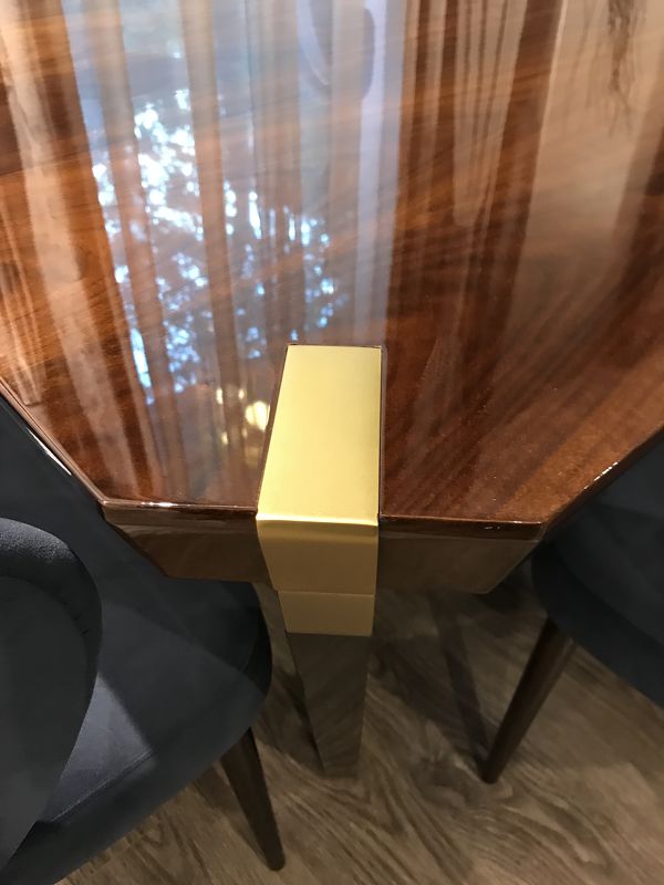 Обеденный стол раздвижной, отделка 735 глянцевый шпон ореха, 725 глянцевый шпон темного ореха, M02 латунь