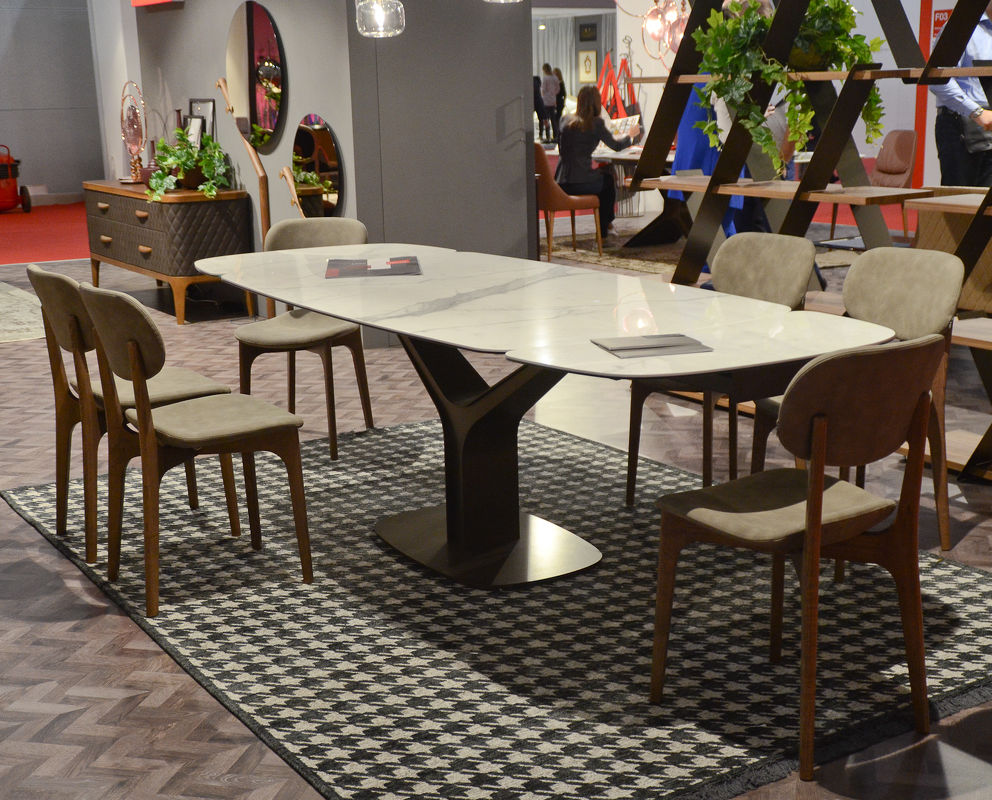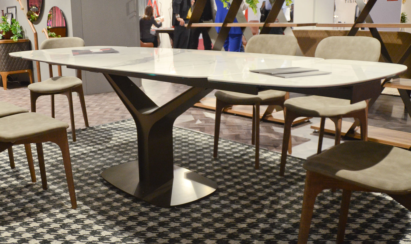 Прямоугольный обеденный стол на фигурной стальной ножке выполнен в стиле модерн. Дополнен керамической столешницей со скругленными углами и двумя расширениями. Длина в сложенном виде 180 см, в разложенном - 260 см.