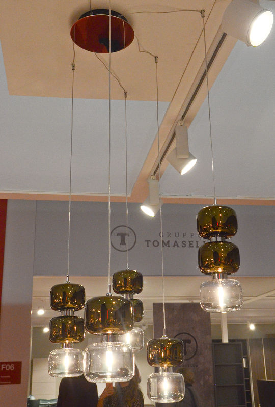 Люстра с пятью элементами выполнена в стиле модерн из разноцветного стекла.