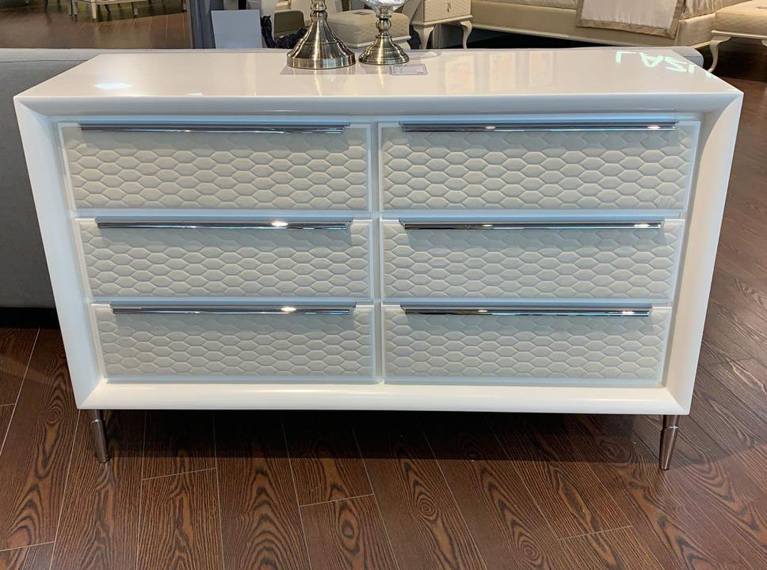 Комод, отделка жемчужный белый лак, ткань Anyzo-01 с рисунком