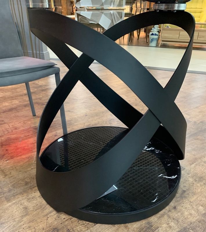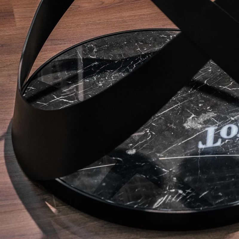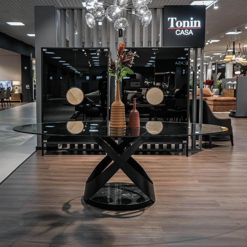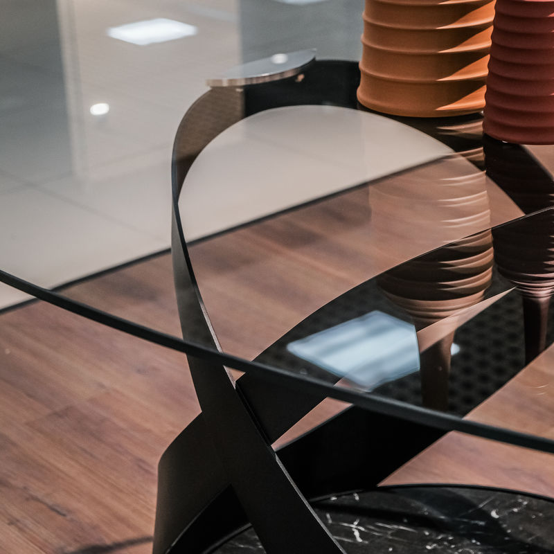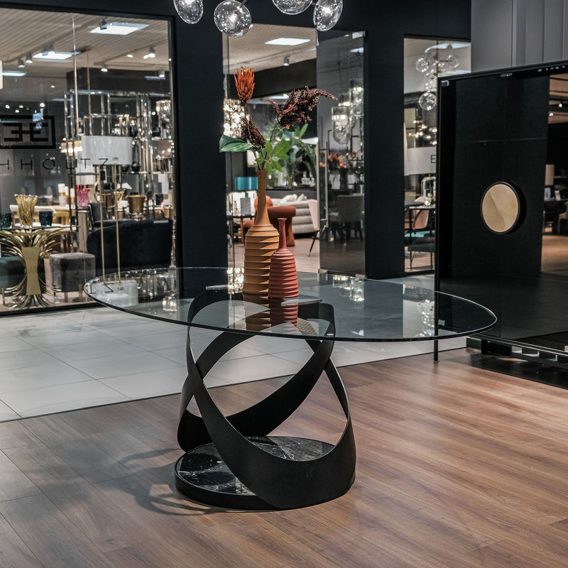 Обеденный стол Capri, отделка матовый черный металл, черный мрамор Marquinia, прозрачное стекло