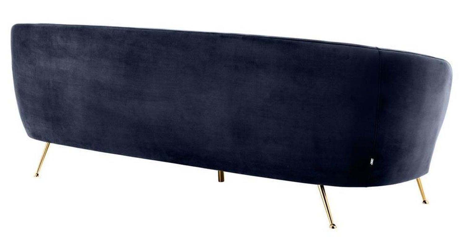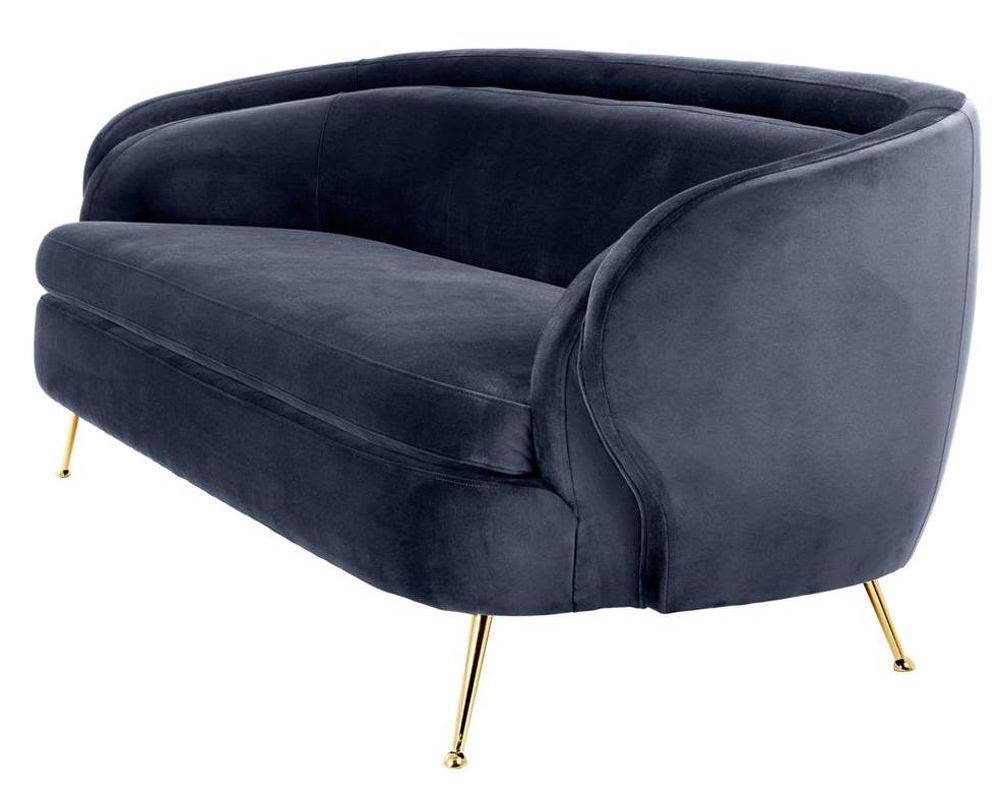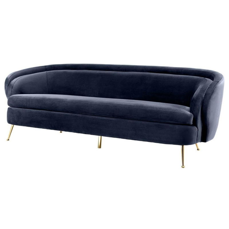 Атмосферный темно-синий вельветовый диван от популярной фабрики Eichholtz (Нидерланды) в стиле ар-деко. С низкой плавной спинкой, переходящей в закругленные подлокотники. Ножки — латунь.