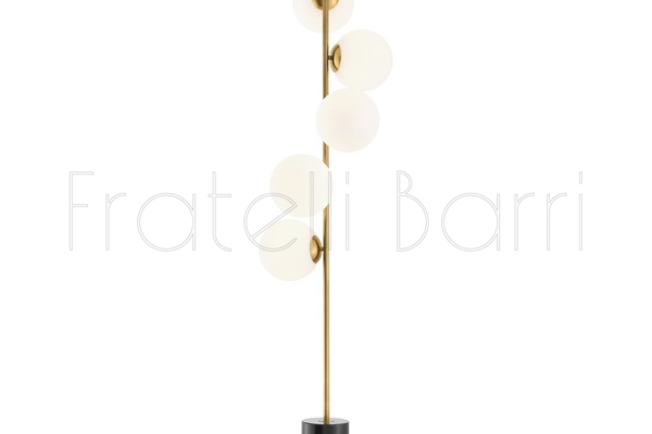 Этот современный торшер придаст по-настоящему современный вид вашей гостиной или спальне. Он оснащен 5 сферическими абажурами из прозрачного стекла на стержне из античной латуни и эффектно контрастирующим цилиндрическим основанием из черного мрамора.