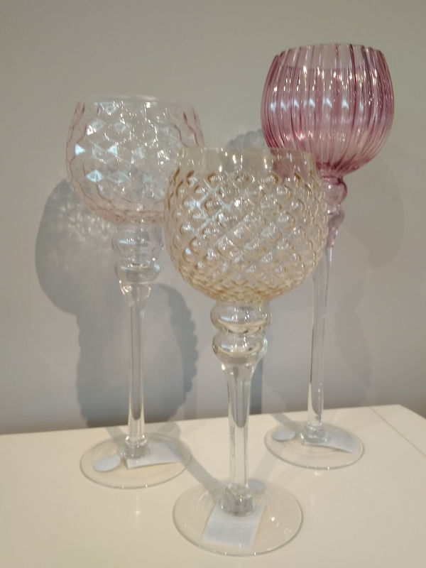 Подсвечник в виде бокала на высокой ножке выполнен в стиле ар-деко из стекла.