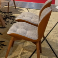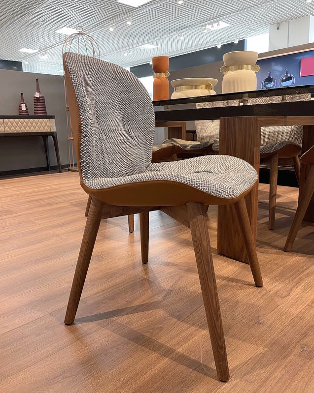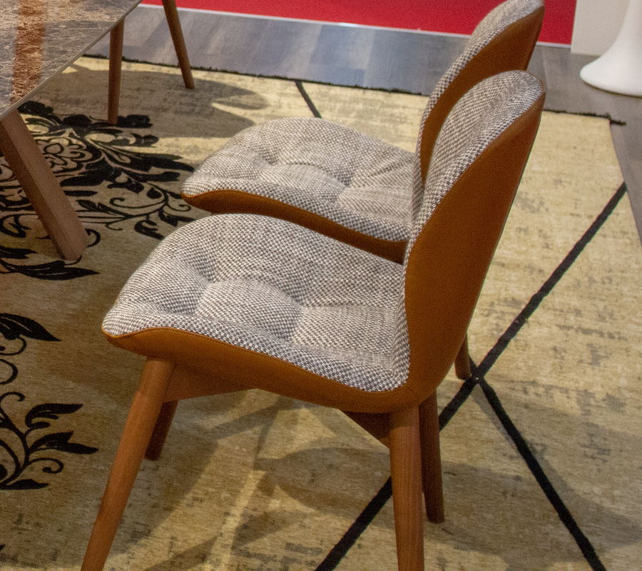 Стул на деревянном каркасе с прямыми ножками, выполнен в современном стиле. Внешняя часть корпуса обтянута кожей цвета коньяк, внутренняя часть выполнена в серо-белой ткани. Такой контраст обивки придаёт стулу характера и уникальности.