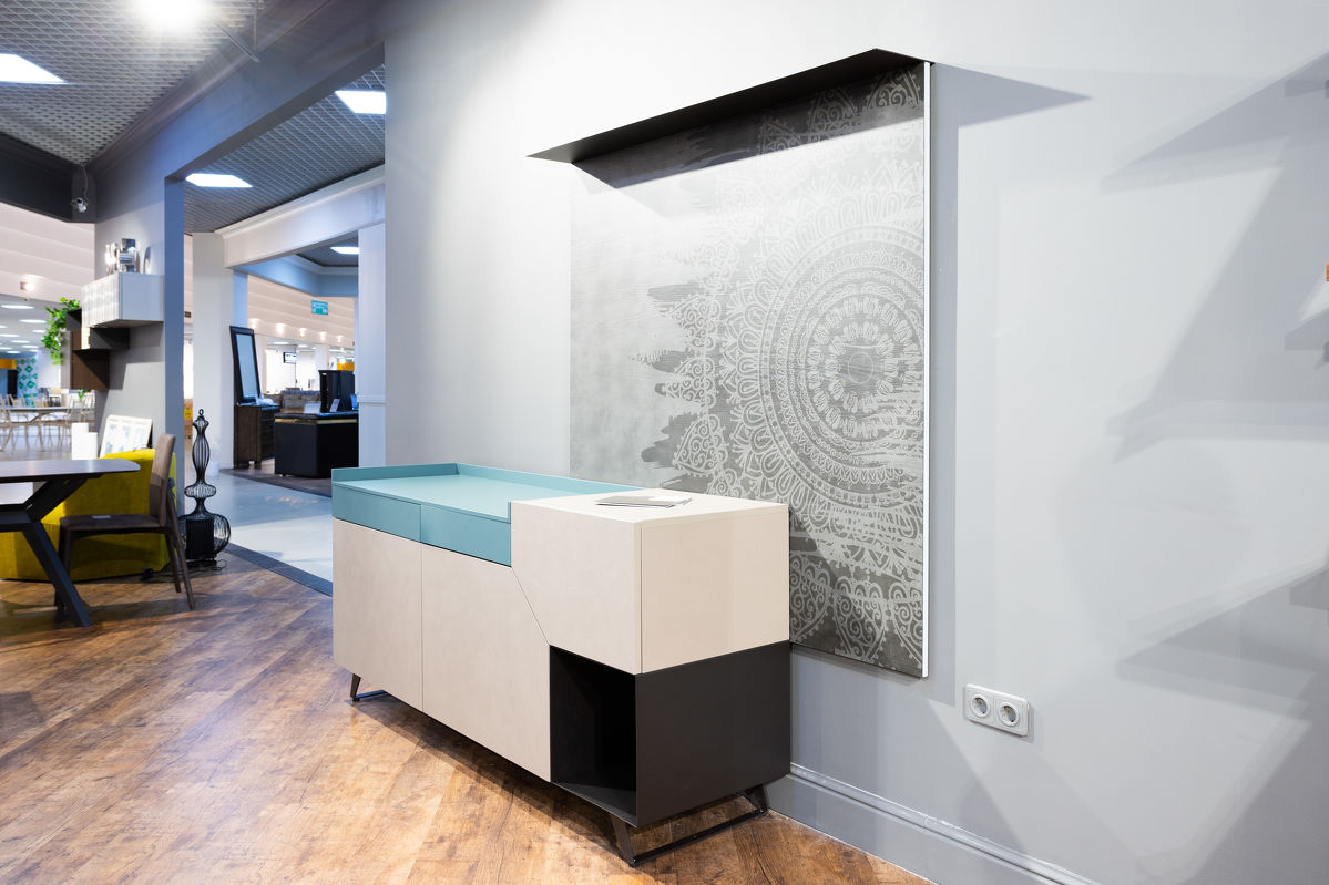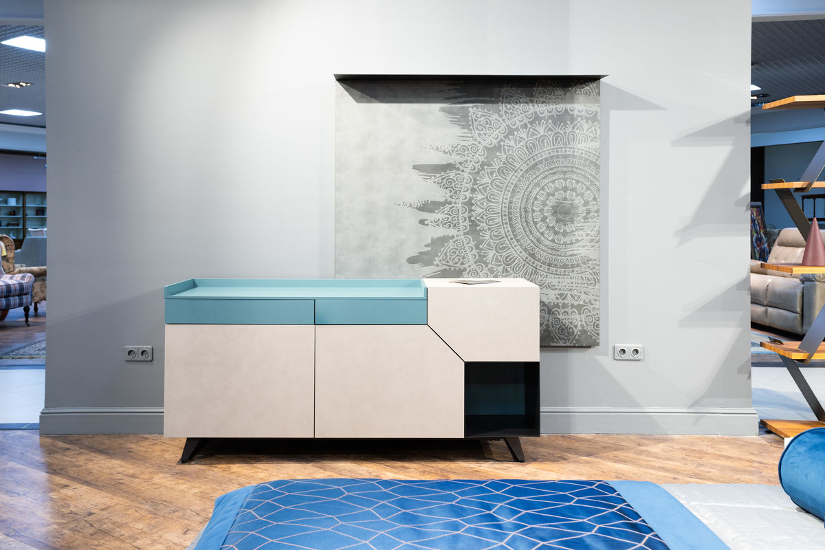 Буфет на металлическом основании выполнен в современном стиле из лакированного ДСП. Оснащен открытой полкой, двумя ящиками и тремя фигурными дверцами, образующими геометрический узор на фасаде. Топ с бортиками. Ящики дополнительно оборудованы системой плавного закрывания и металлическими направляющими с ограничителями.