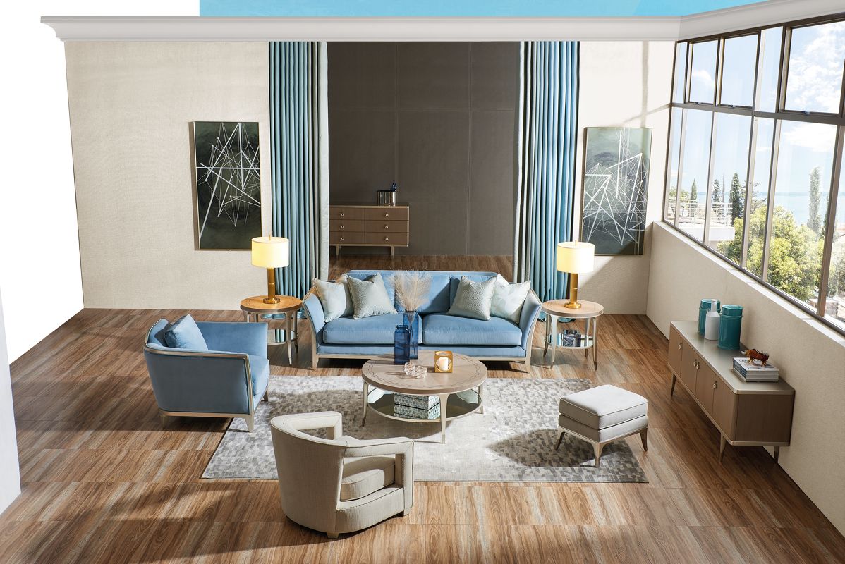Выполнен из массива дерева. Обит тканью из ассортимента фабрики в голубых тонах. Тип ткани - велюр. Состав ткани - 100% полиэстер.
