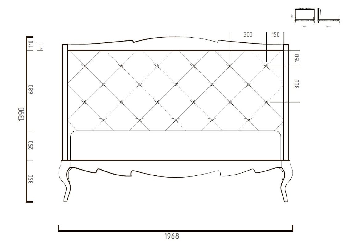 Ножки, база и «корона» изголовья в отделке сусальное серебро, покрытое лаком шампань методом ручного нанесения.