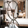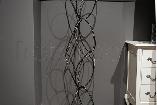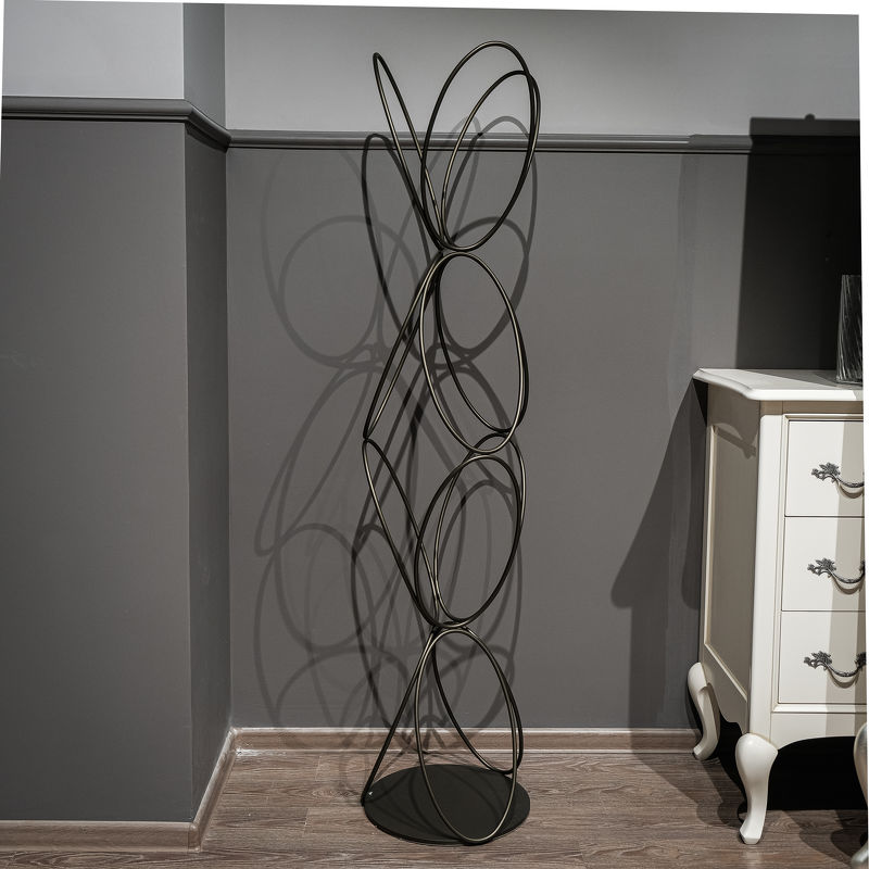 Напольная вешалка для одежды выполнена в современном стиле из окрашенного металла. Фигурная стойка из петель делает конструкцию воздушной, и не утяжеляет интерьер.