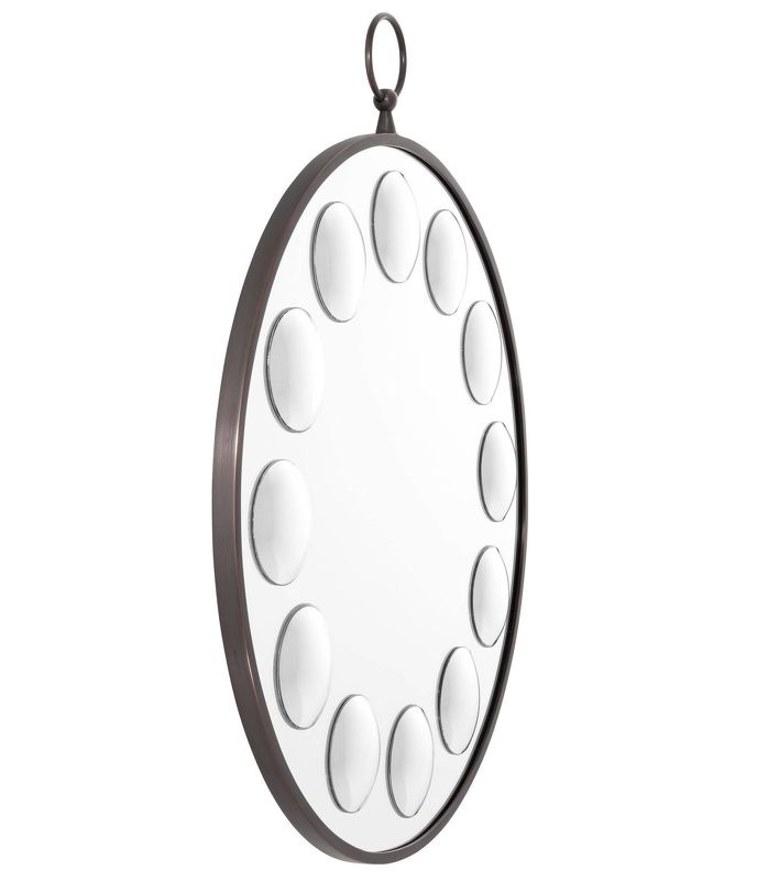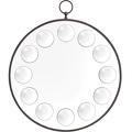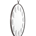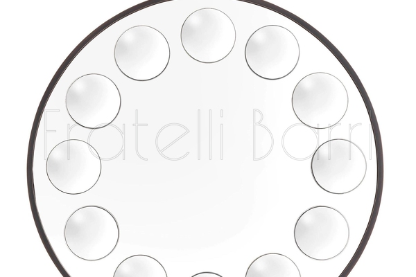 Круглое зеркало выполнено из латуни, задняя стенка из МДФ. Зеркальная панель по периметру декорирована выпуклыми вставками.