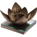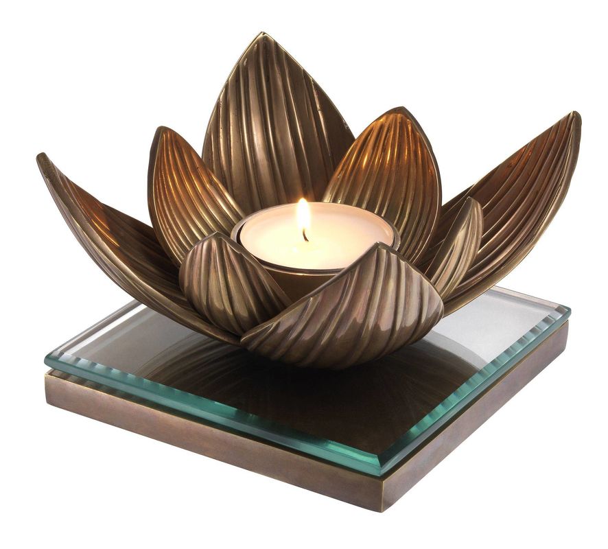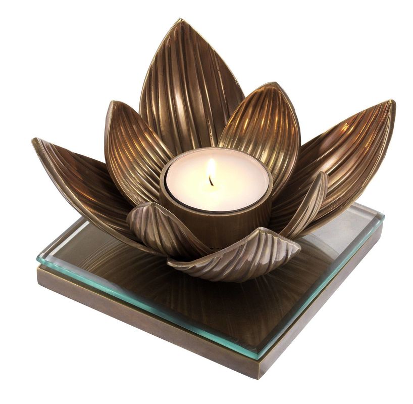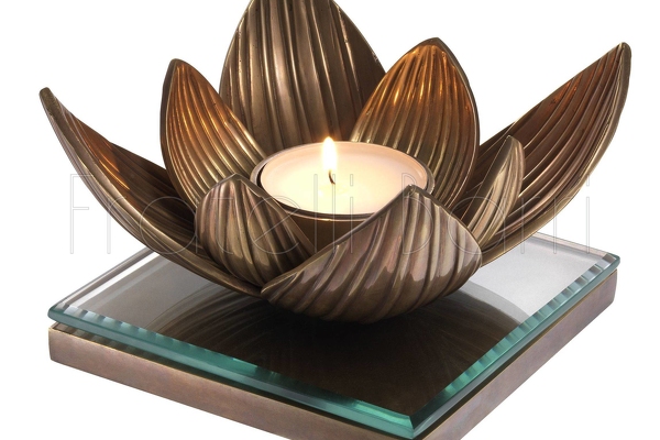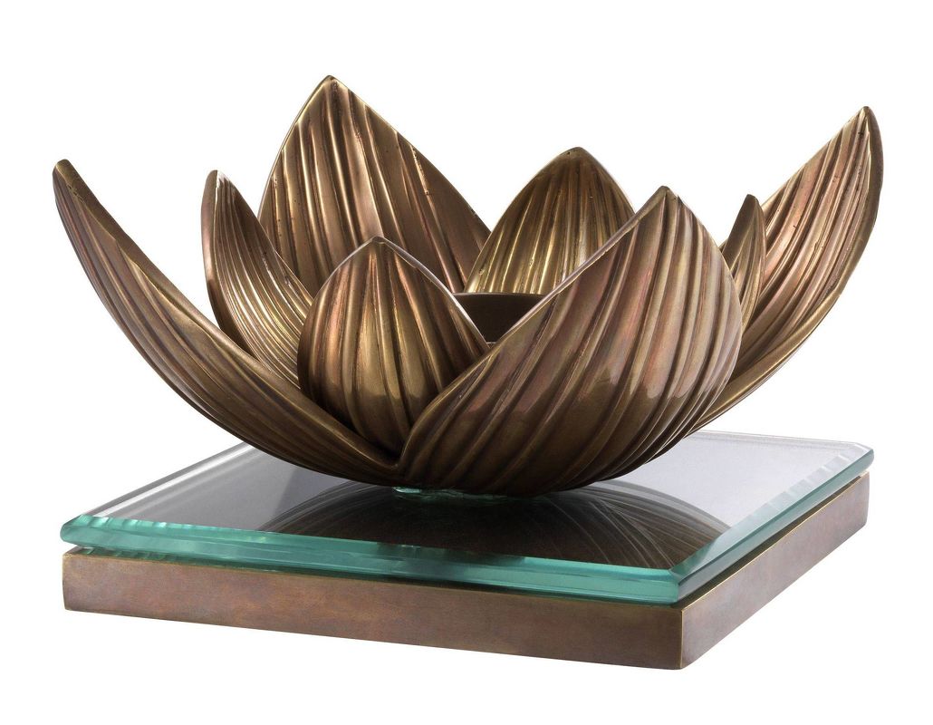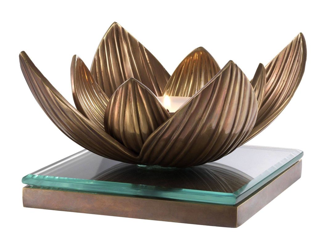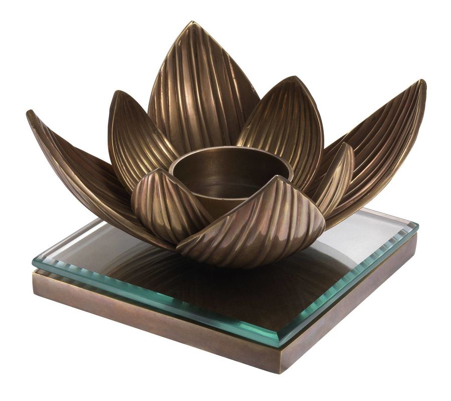 Фигурный подсвечник в виде цветка лотоса выполнен из латуни. Квадратное основание дополнено стеклянным топом. Подсвечник рассчитан на одну свечу.