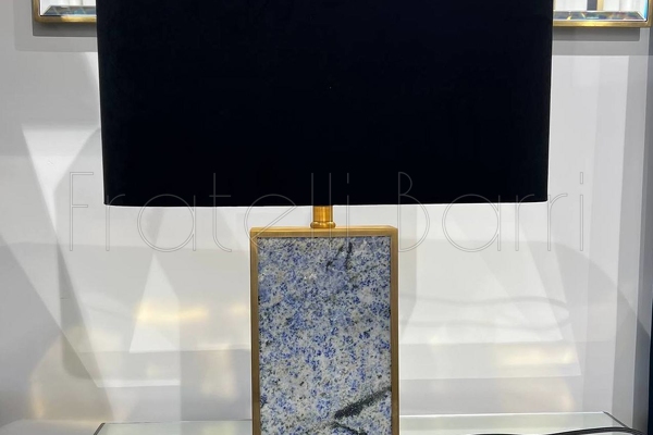 Ее прямоугольное основание из черного мрамора заключено в металлический каркас с отделкой из античной латуни. Эта лампа в комплекте с прямоугольным абажуром из черного бархата с золотистой внутренней поверхностью идеально подходит для установки по бокам дивана или кровати.