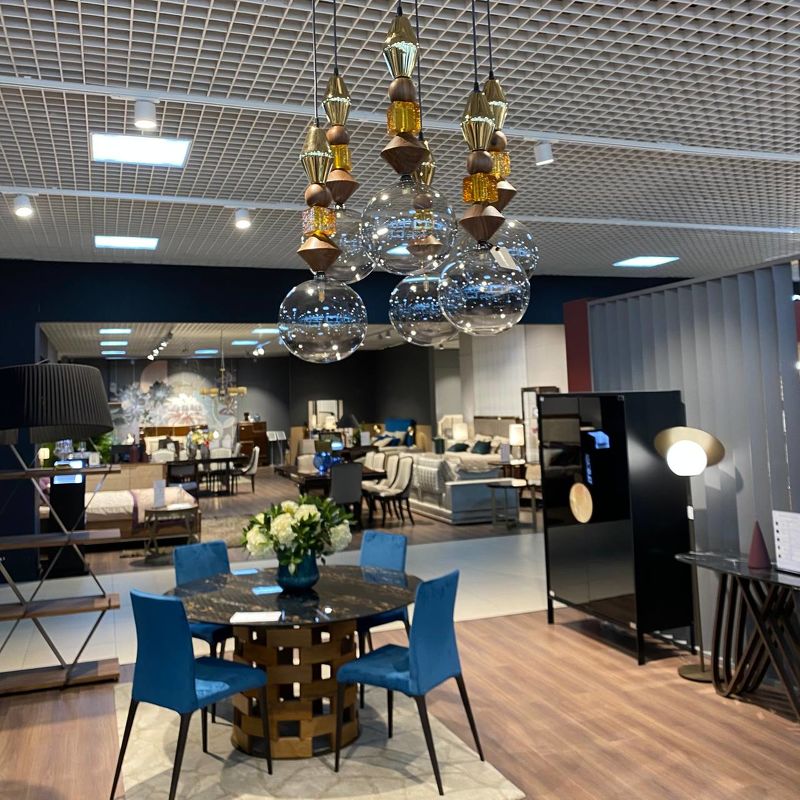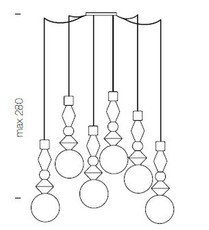 Люстра на длинном подвесе выполнена в стиле модерн. Шесть фигурных плафонов вместе создают эффектное освещение. Плафоны декорированы вставками из массива дерева и тонированного стекла.