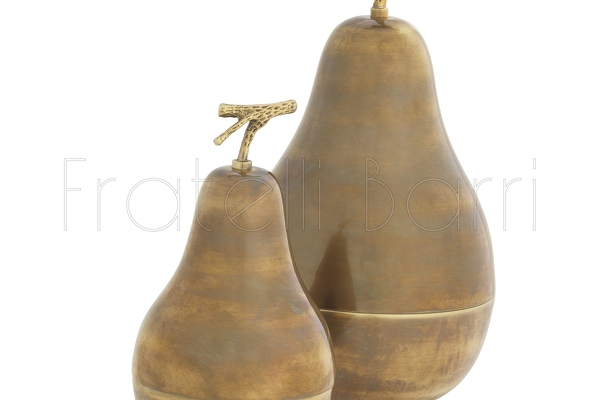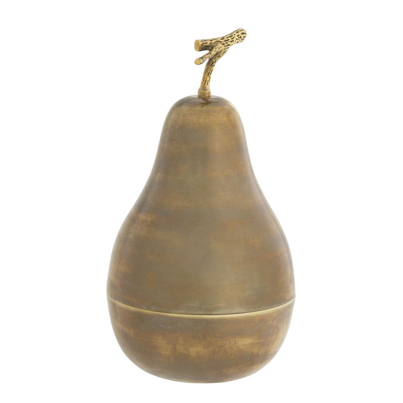 Комплект из двух боксов в виде груши изготовлен из латуни. Такой декоративный элемент привнесет штрих гламура и элегантности в любое пространство, а коробочка идеально подойдет для хранения сладостей, ключей или мелких безделушек.