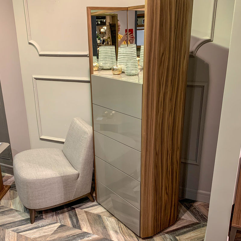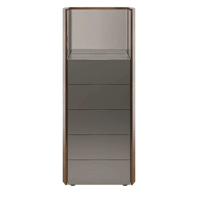 Комод высокий с зеркалом, отделка шпон ореха F, серый глянцевый лак