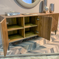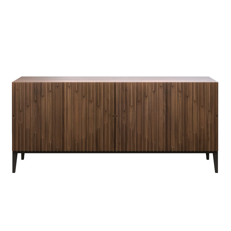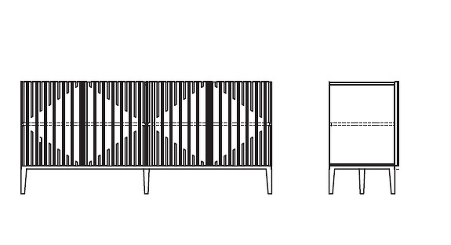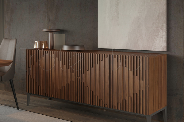 Буфет от бренда Mod Interiors изготовлен из высококачественного, шпонированного МДФ высокой плотности, металлические ножки. Фасады декорированы симметричным реечным узором.